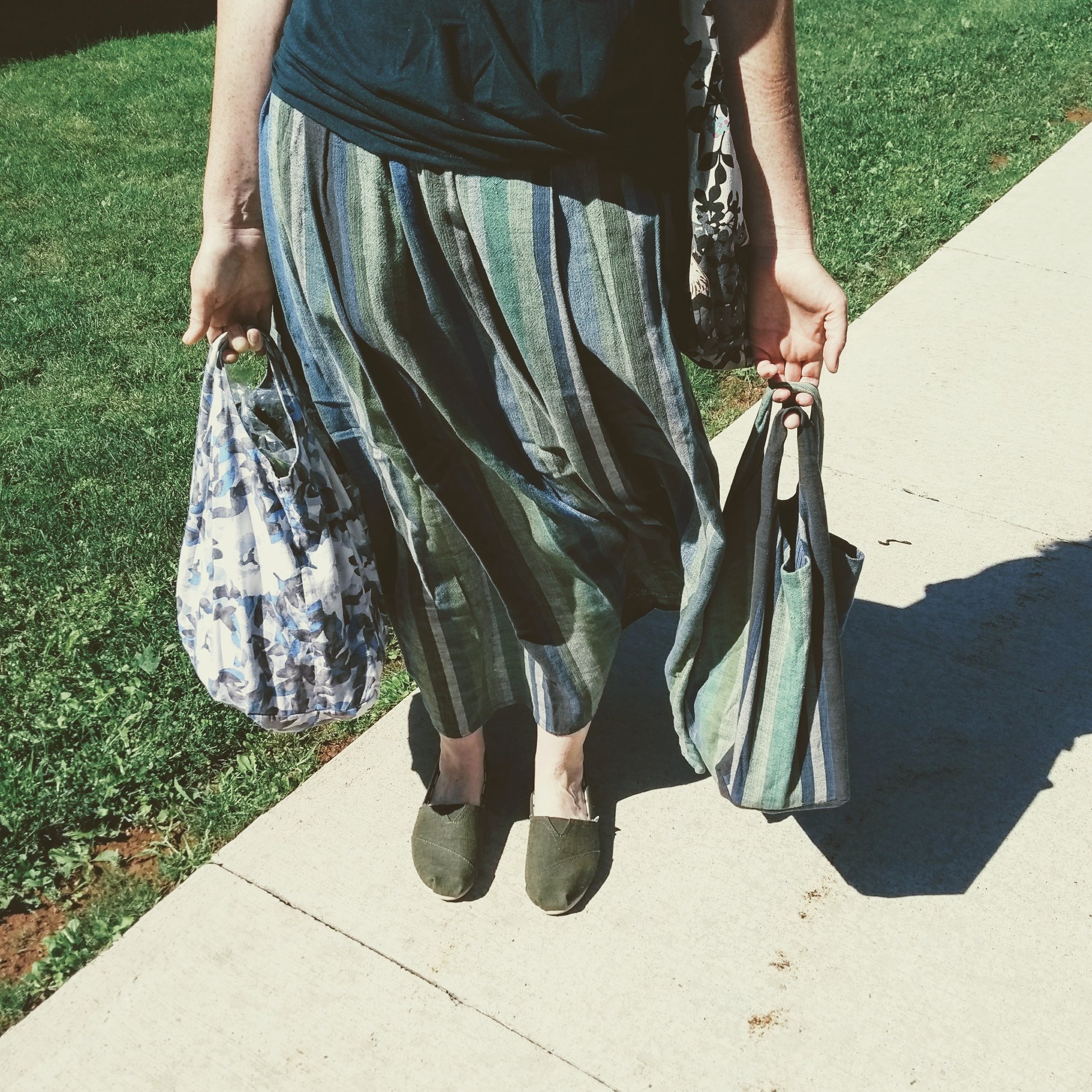 One of my summer ones matches my reusable shopping bag a little too well. They're made from a breezy, lightweight cotton we bought secondhand at our favourite annual fabric fundraiser. Linen works, too! If you wear a big skirt to the beach, you have your own personal changing tent.