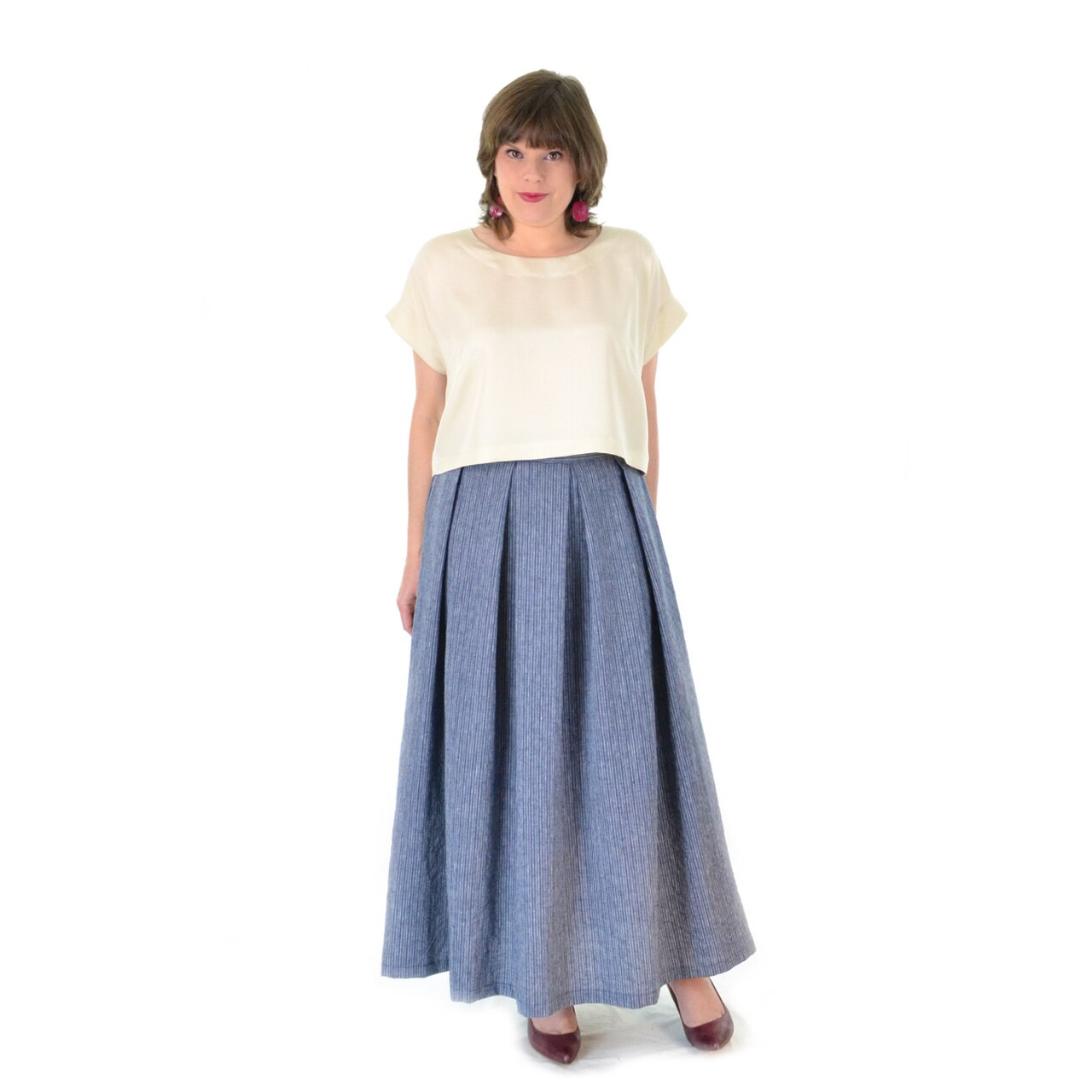 But this week, E took our fresh, hard-earned knowledge of pants waistbands and applied it to my beloved skirt pattern. The Big Skirt is now available to everyone! It's newly zipper-free and weight-fluctuation-friendly. Its waistband is pull-on style, with a flat front and a soft elastic back.