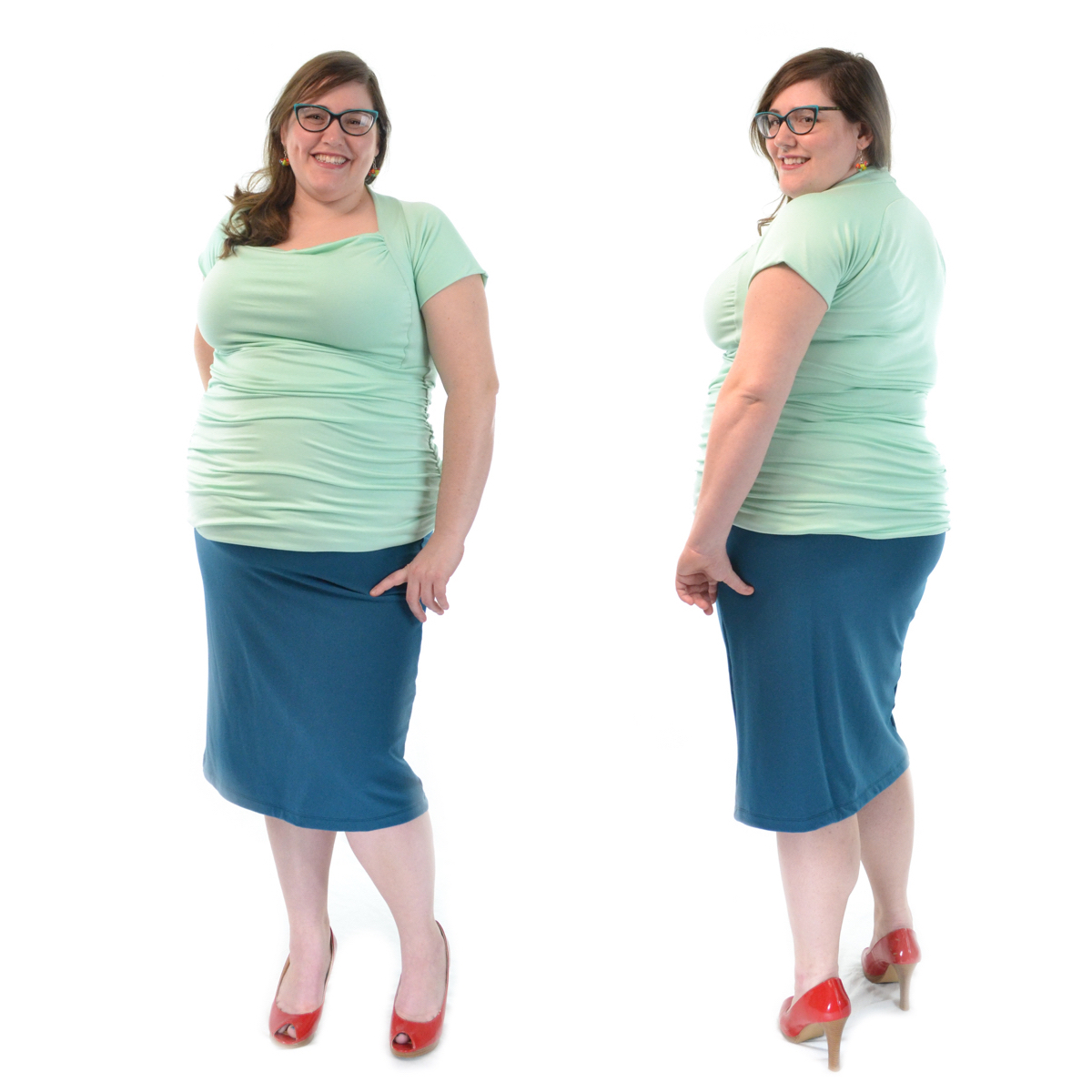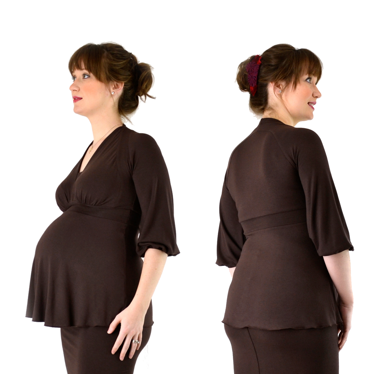 From the waist down, you have several options for silhouette. Tops can have a smoothing double layer bottom portion (either flat or ruched), or a flowy single layer bottom (either a-line or full). The flowy option can be cut to create a fabulous maternity top: