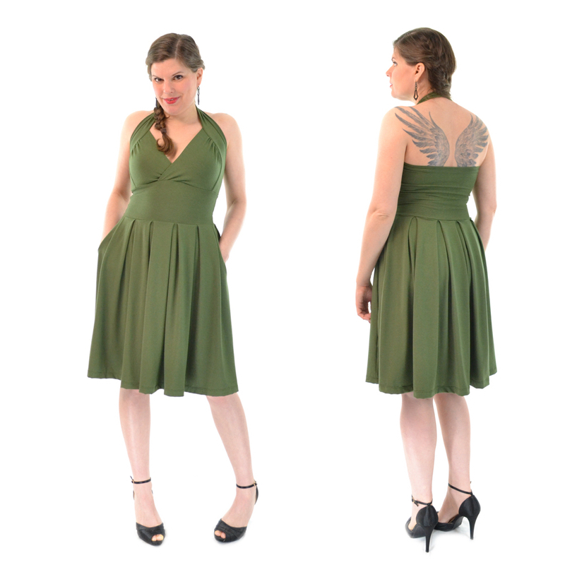 Mix & Match Dress: Roses bodice, halter back, with a pocketed pleated skirt in Olive