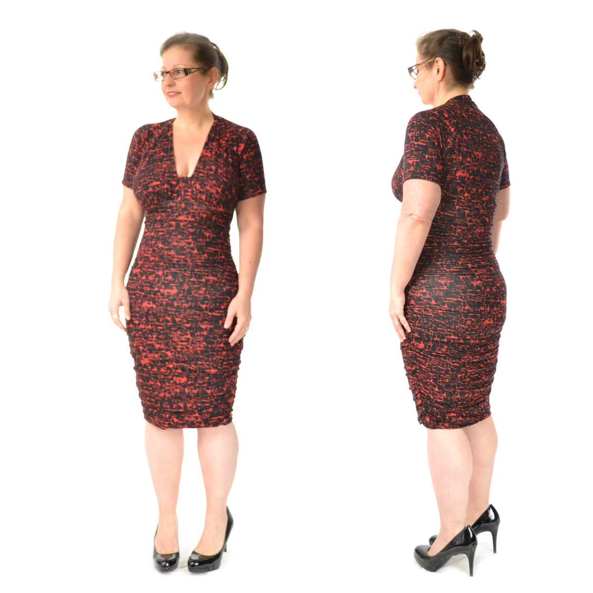 Mix & Match Dress: Tab bodice, fitted half sleeve, with a ruched skirt in red/black print