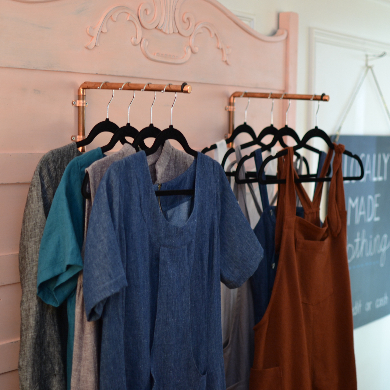 We've been busy busy beavers this last week assembling a showroom space in our home studio. We pulled our old market racks out of storage, then built a few more displays from salvaged bits and bobs around the house (we have an excellent stash of vintage furniture pieces and related hardware). Signage is up, clothes are freshly tagged, and the change room works like a charm. Thanks so much to everyone who came out to our soft opening on Saturday ❤️