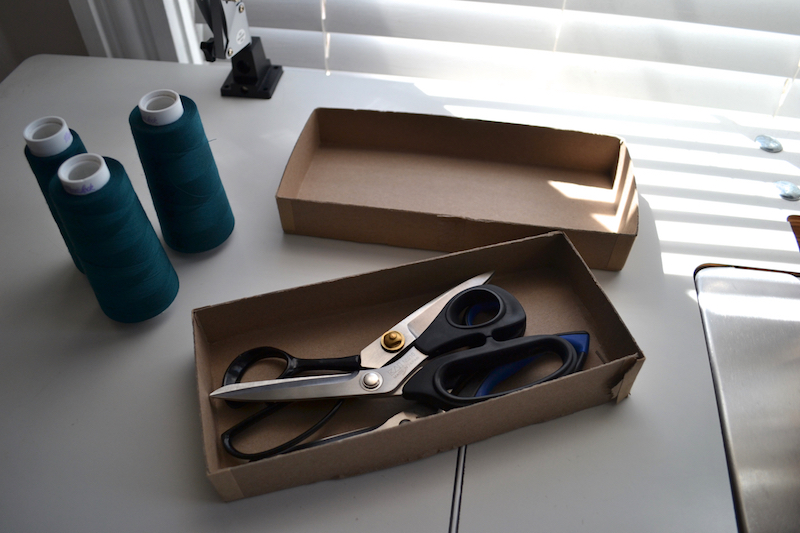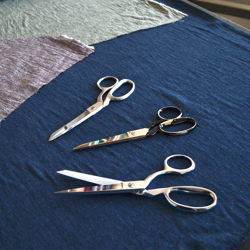 The Serious Scissors. Best for heavy wovens like denim, hemp, linen, and wool. A Gingher pair (made in Italy), Singer (made in Brazil, gifted to us by one of our favourite local purveyors of antiques), and a mystery pair (also made in Italy) that either came from Montreal in the 90s or my mother's sewing stash. All of these hurt my hand to use for more than one garment, so they are Emily-only use, usually for alterations.