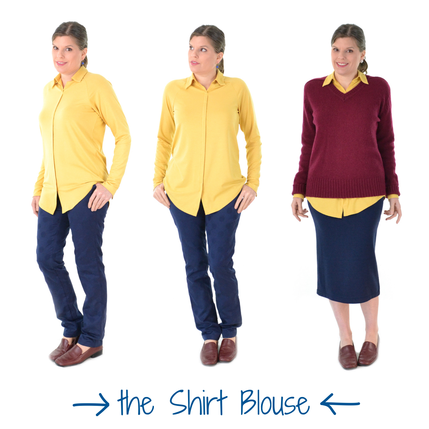 I’ve also used this ‘separate fronts stitched together’ on the Shirt Blouse, made in the jersey fabrics. It too is a glorified V neck, meant to be an underlay piece. I wanted the front hem to add visual interest and a transition between a print pant and a bulky sweater. I was looking for the most effective barrier between me and the (usually scratchy woollen) sweater. The collar and cuffs provided that barrier.