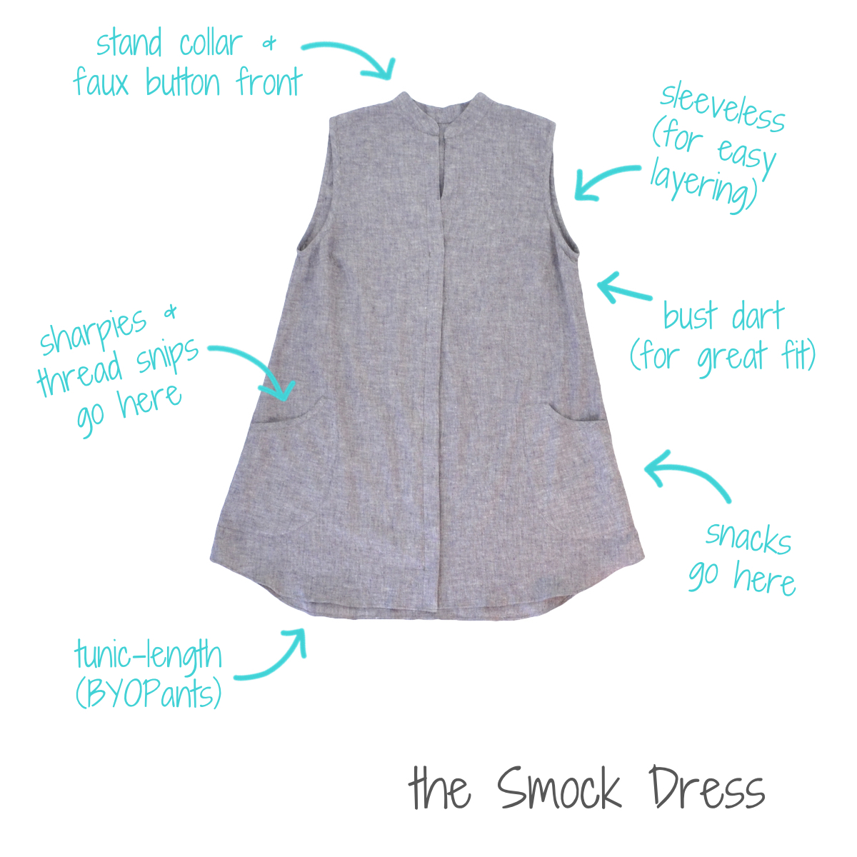 The Smock Dress pattern is one that we’ve been test fitting on local customers. It's a new take on a lightweight camisole, a V neck with more coverage. The tunic is cut in two pieces for the sake of visual interest. It’s stitched down centre front to avoid the extra step of buttonholes and the finding of findings. I like to minimize the barriers to construction whenever possible :)