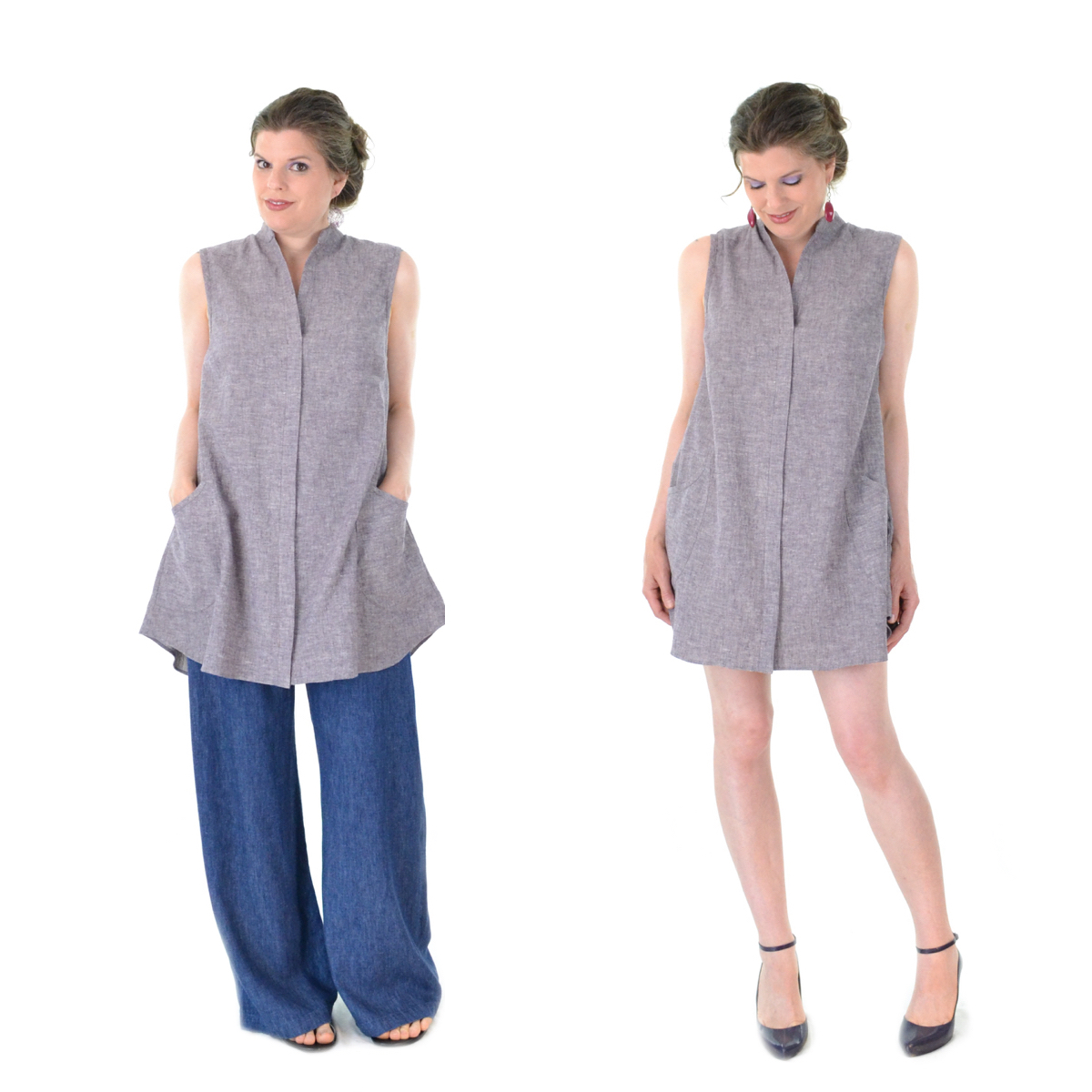 Shirt Blouse (button version) in Sunset bamboo jersey; Smock Dress (button version, with added sleeves) in hemp denim
